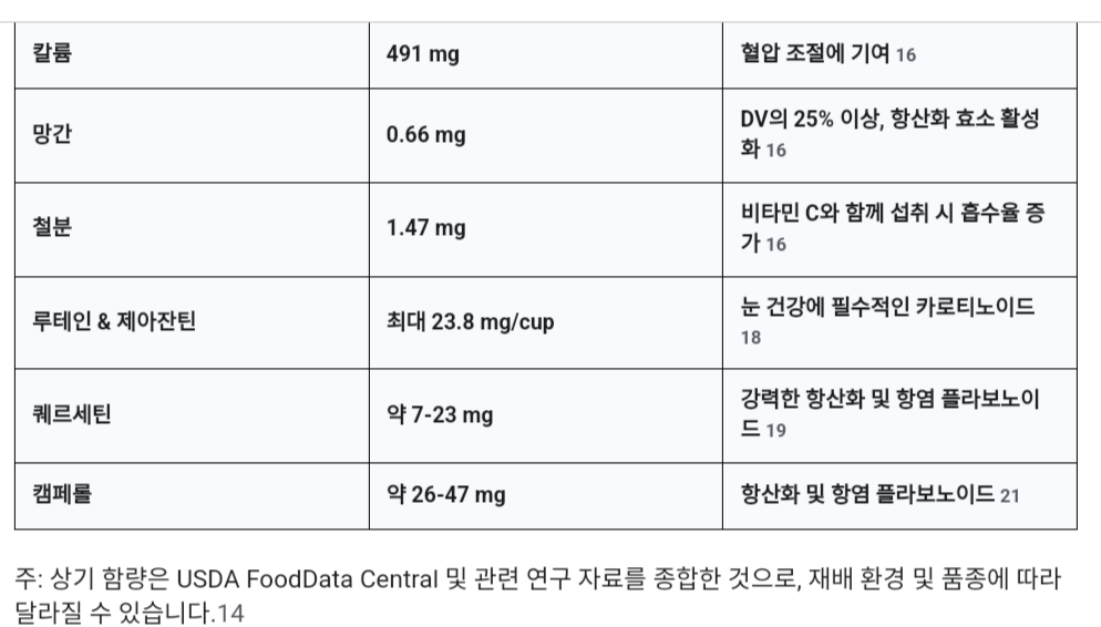 무엇이 케일을 특별하게 만드는가 케일이 '슈퍼푸드'라는 명성을 얻게 된 것은 단순히 마케팅 용어 때문이 아니라, 최소한의 칼로리로 최대한 의 영양소를 공급하는 압도적인 '영양 밀도'에 과학적 근거가 있기 때문입니다. 생 케일 한 컵(약 21g)은 단 7-8 칼로리에 불과하지만, 주요 비타민의 일일 권장 섭취량(DV)의 상당 부분을 채울 수 있습니다. 케일의 영양 프로필에서 주목할 점은 단순히 각 영양소의 함량이 높은 것을 넘어, 영양소 간의 시너지 효과 를 통해 생체이용률을 극대화한다는 점입니다. 예를 들어, 케일 100g에는 약 120mg의 풍부한 비타민 C 가 함유되어 있는데, 이 비타민 C는 식물성 식품에 함유된 비헴철(non-heme iron)의 체내 흡수율을 높이는 역할을 합니다. 따라서 케일에 함유된 철분(1.47mg/100g)은 다른 식물성 철분 공급원보다 더 효율적으로 우리 몸에 흡수될 수 있습니다. 또한, 케일의 칼슘은 우유보다 생체이용률이 더 높다는 연구 결과도 보고된 바 있어, 양뿐만 아니라 질적으로도 우수한 미네랄 공급원임을 알 수 있습니다.