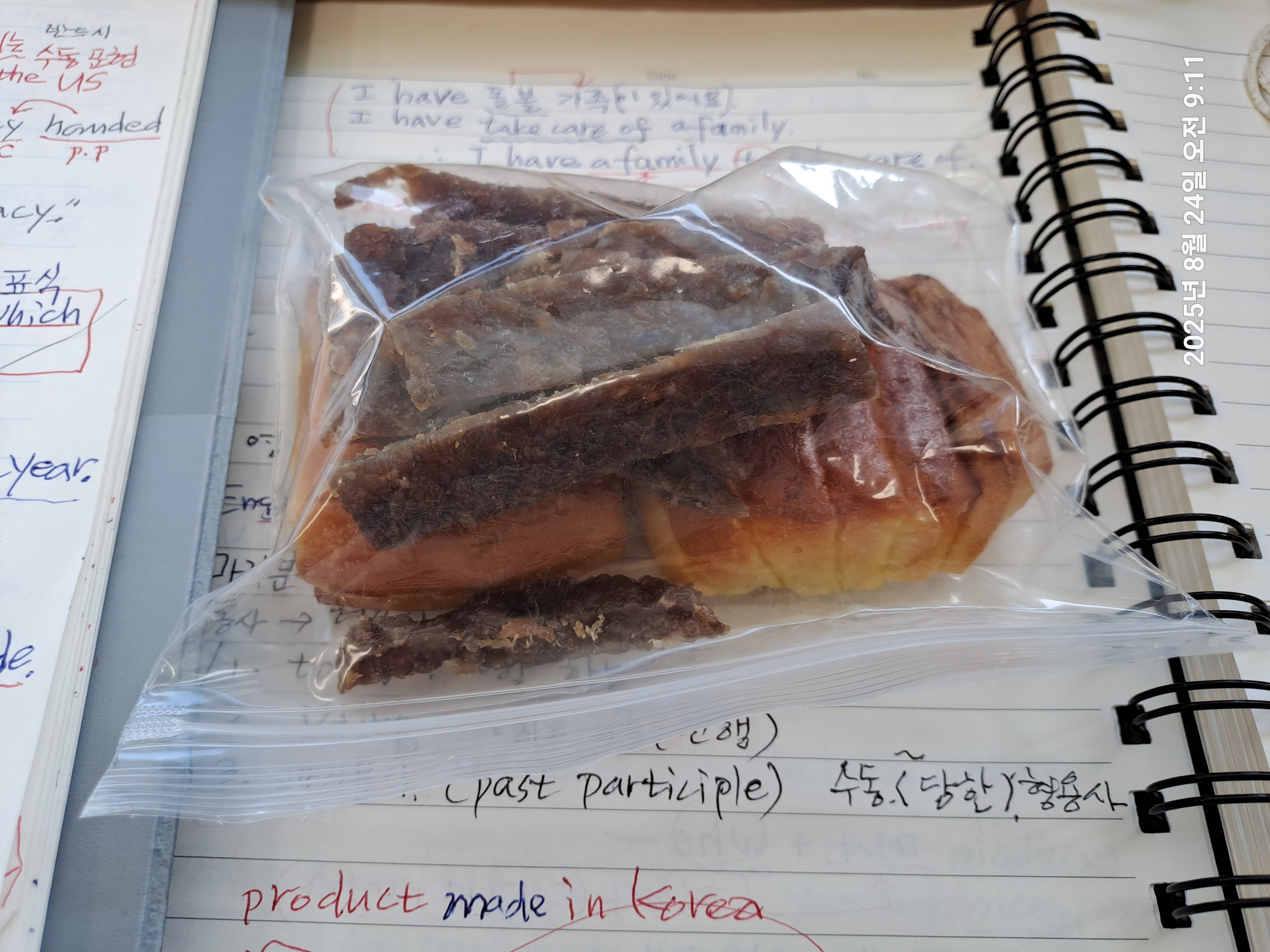 오늘은 육포 몇 조각과 빵 쪼매 가방에 넣어...
