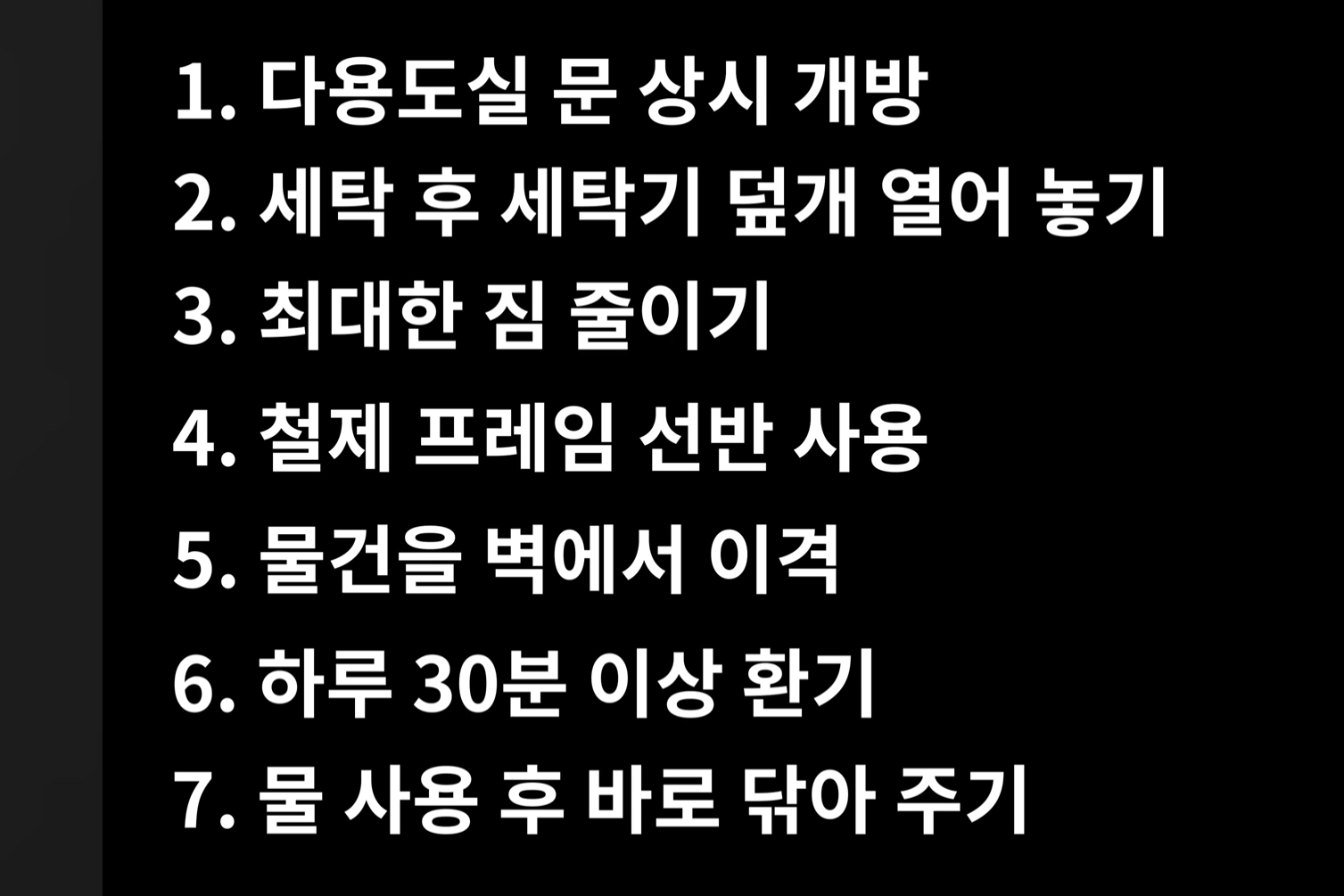 결로는 상대습도 100%면 무조건 생겨나고, 곰팡이는 상대습도 80%에서 생기기 시작한다네.