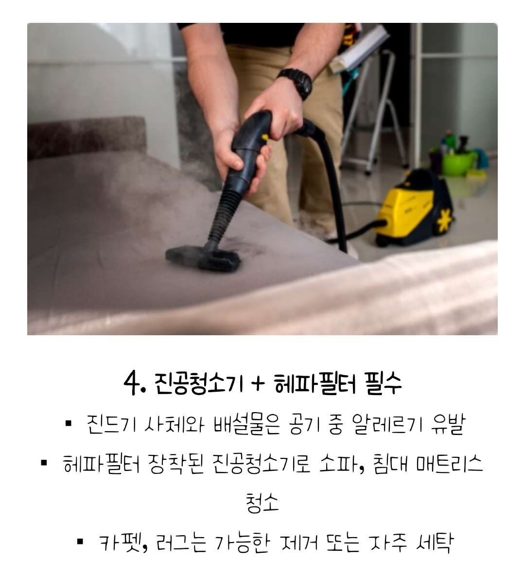 · 주기적인 사용: 집먼지 진드기는 번식력이 강하므 로 꾸준한 관리가 필수입니다. 일주일에 1~2회 정 도 정기적으로 사용해주시면 진드기 퇴치 및 억제 효과를 유지하는 데 도움이 됩니다.