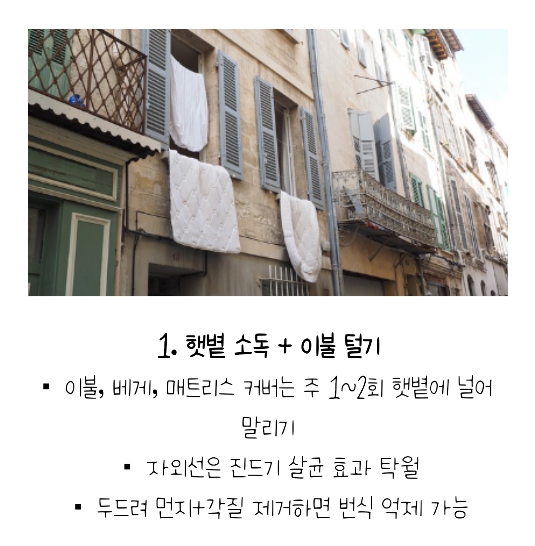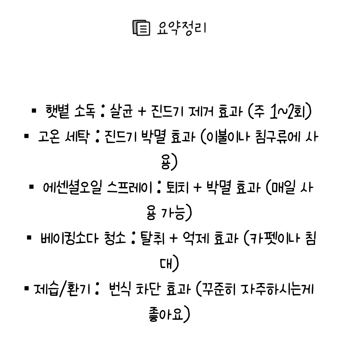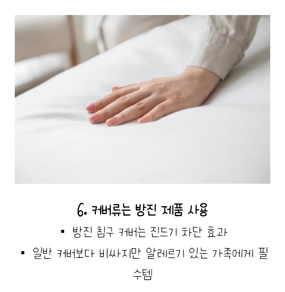 · 뿌리는 곳: 집먼지 진드기가 가장 많이 서식하는 곳 은 바로 침구류(이불, 베개, 매트리스), 소파, 커튼, 카펫, 인형 등 섬유 소재입니다. 이런 곳에 골고루, 하지만 너무 흠뻑 젖지 않도록 가볍게 분사해 주세 요. 저는 주로 자기 전이나 청소할 때 뿌리는 편이에 요.